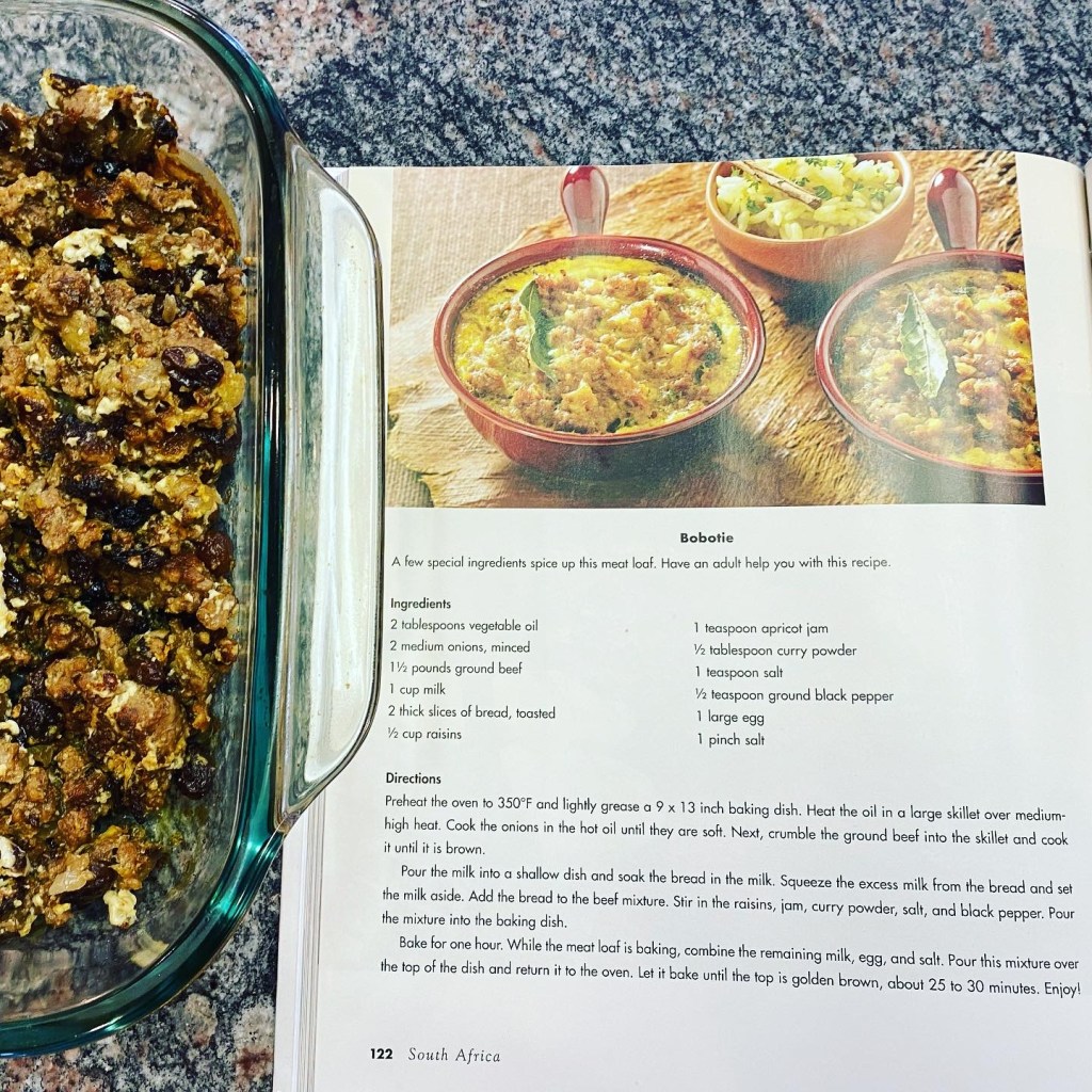 We made this bobotie recipe from the Enchantment of the World South Africa book. While it doesn’t look anything like the picture it was very yummy. We followed this recipe to perfection, so I’ll have to look for a different recipe next time because it’s definitely going in our rotation.